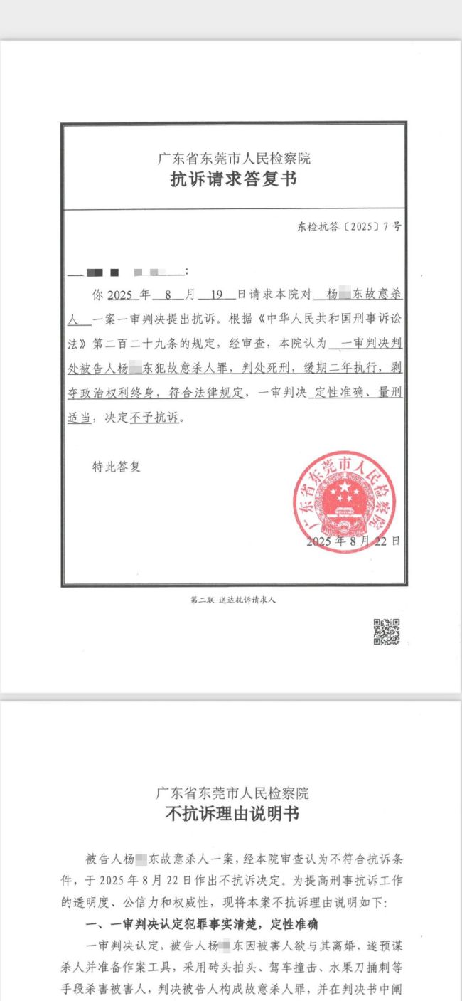 广东佛山一名26岁女子因欲离婚,被其丈夫杨某东开车撞击并捅刺致死。一审判决中,杨某东被判死刑缓期二年执行。随后,被害人家属向东莞市检察院申请抗诉,但遭到驳回。
