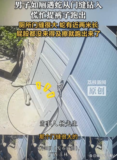 男子如厕遇大蛇闯入慌忙提裤逃窜 惊魂一幕。广西玉林的一名男子在茅厕上厕所时,经历了一次惊心动魄的遭遇。他刚蹲下就听到地上有“沙沙”的声音,低头一看,一条蛇从门缝钻了进来,并抬起头看向他。男子吓得连裤子都没来得及提上,就赶紧破门而出。网友调侃说,这真是“屁滚尿流”的真实写照。