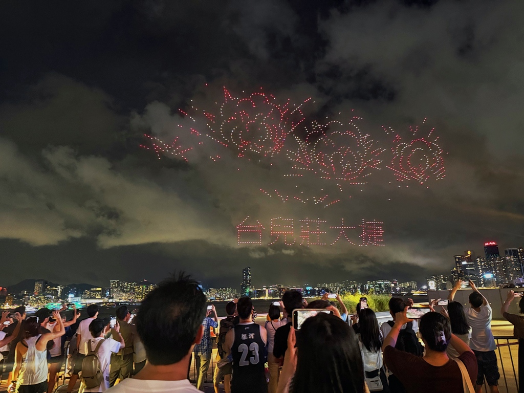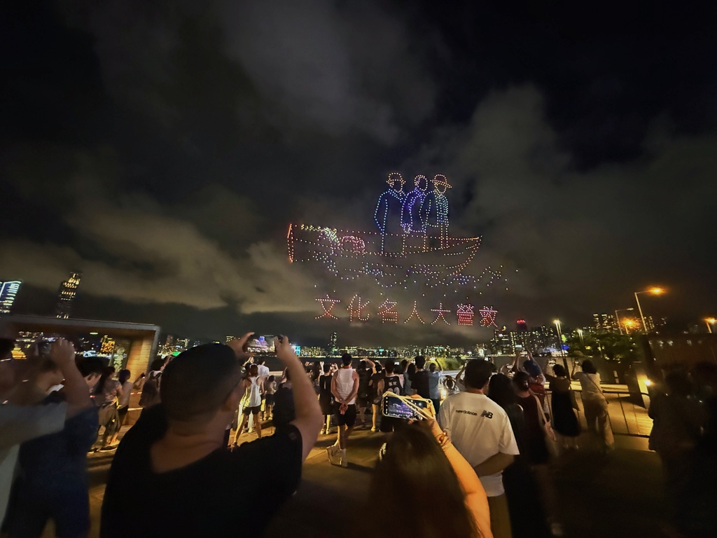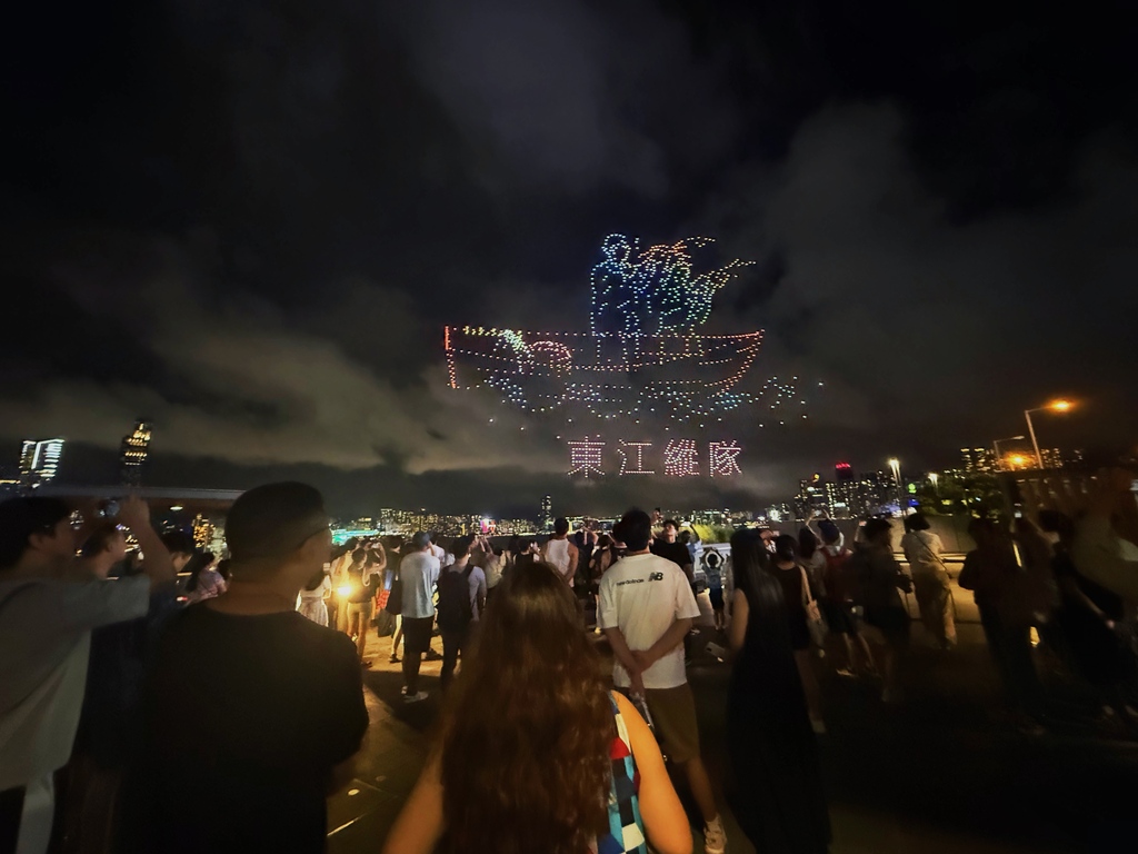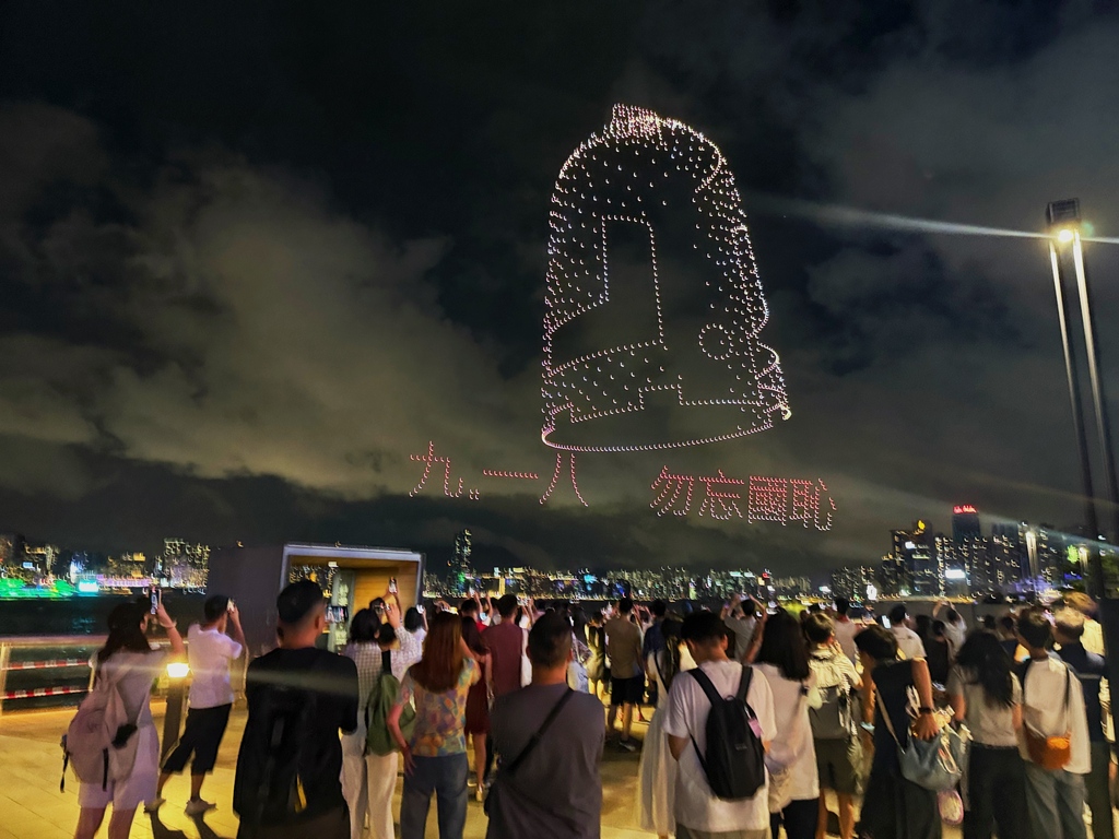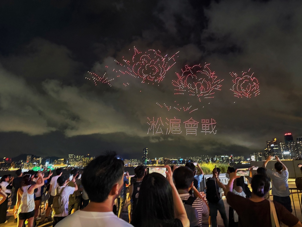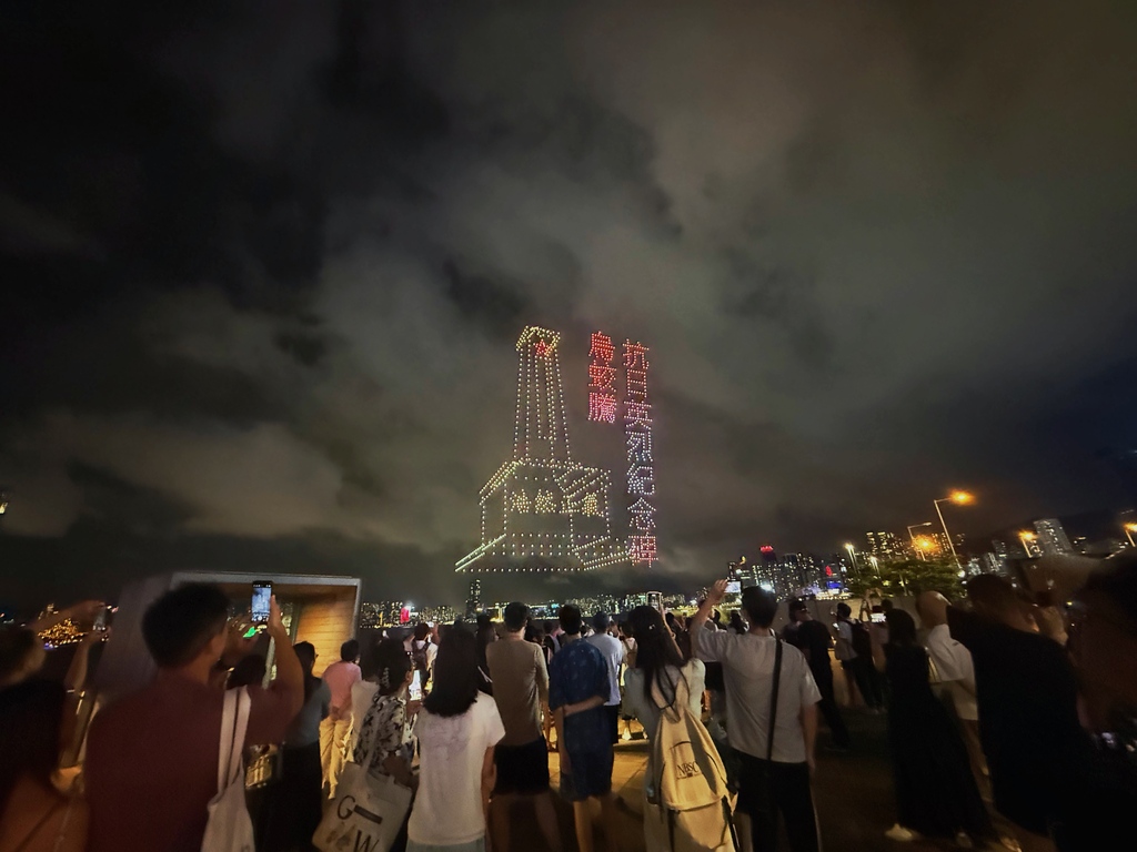 表演开始时,无人机首先拼凑出“九一八勿忘国耻”的字样,随后展示了卢沟桥“七七事变”、东江纵队持枪作战等图案,结合现代科技和艺术,讲述了中国人民奋勇抗战的历程。其中一幕再现了1945年8月15日一份报纸头版上印着“日本投降矣!”字样的画面。整个表演持续约15分钟,吸引了许多市民提前到场占位,并在表演期间高举手机拍摄留念。