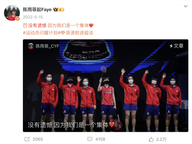 赛后安洗莹接受采访时坦言自身失误太多,并向陈雨菲致以敬意:“她今天的表现非常出色,希望她伤势不要太严重,明天能打出精彩的比赛。”
