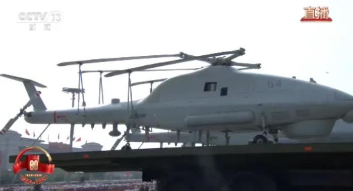 空中无人作战方队接受检阅。受阅的新型察打一体无人机、无人僚机、舰载无人直升机,可隐蔽突击、广域覆盖、自主协同。
