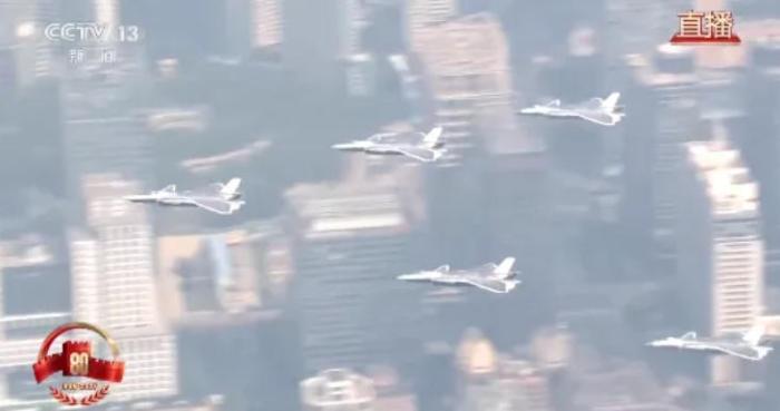 歼35飞过天安门广场上空歼-15DH、歼-15DT、歼-35和歼-15T,编成两个楔队飞过天安门广场上空。