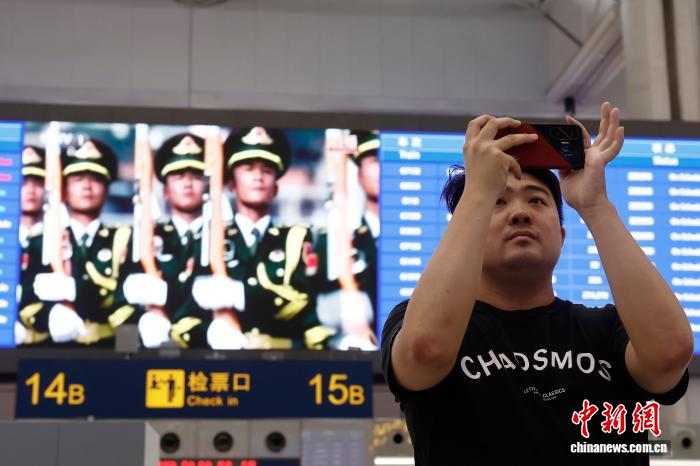 图为在铁路上海虹桥站候车大厅,旅客用手机拍摄视频直播画面。中新社记者 殷立勤 摄
