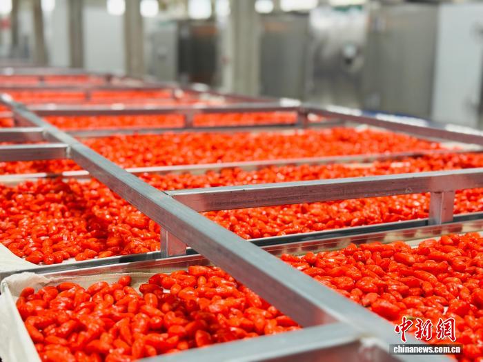 图为青海省格尔木农垦集团枸杞生产线,工人们正在收集采用锁鲜工艺烘干的枸杞。孙睿 摄