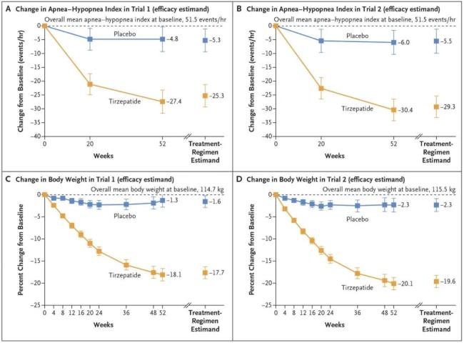 替尔泊肽的疗效已被III期临床研究SURMOUNT-OSA所验证。该研究纳入469名中重度OSA肥胖(非糖尿病)患者,分为“不能/不愿使用CPAP”和“正在使用CPAP”两组,均接受每周1次皮下注射替尔泊肽治疗。