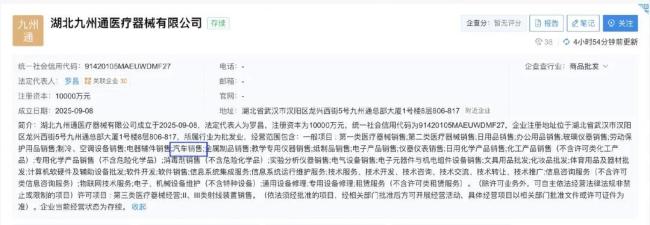 截至目前,九州通今年来已成立四家涉及汽车/电车销售业务的新公司。