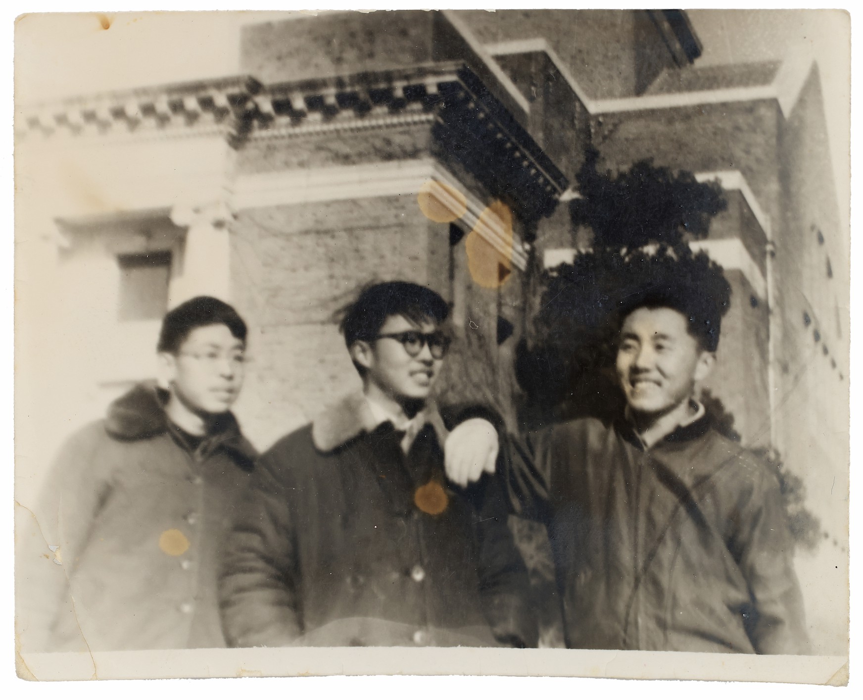 南仁东(右二)与同学在二校门前