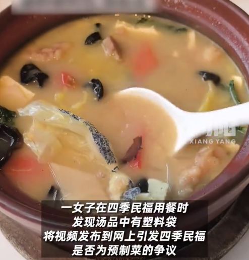 9月17日,北京。一女子在四季民福用餐时发现汤品中有塑料袋,将视频发布到网上引发四季民福是否为预制菜的争议。随后,记者致电四季民福了解情况,得知其汤品中的塑料袋是当天封存蔬菜的塑料袋而非预制菜包装,四季民福员工保证称不是预制菜,如果是预制菜店里出餐也不会那么慢。