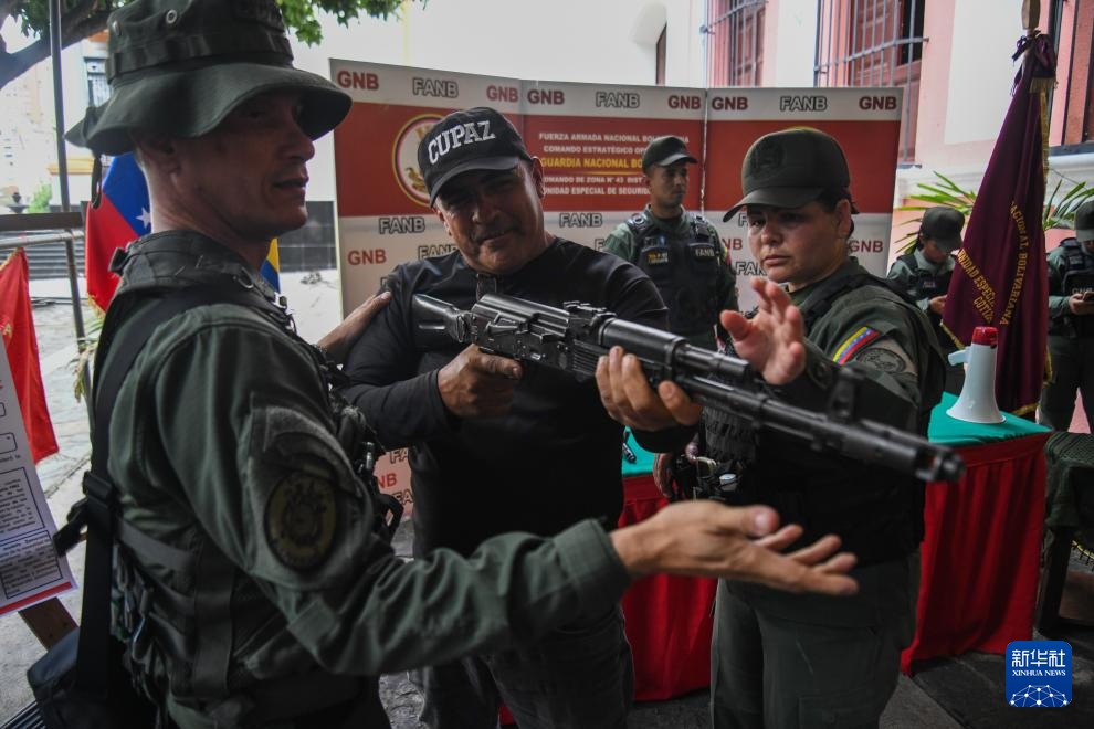 9月20日,在委内瑞拉首都加拉加斯,武装部队人员指导一名参训者使用枪支。新华社发(马科斯·萨尔加多摄)