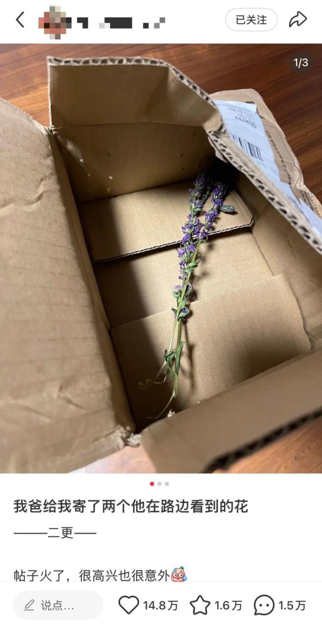 近日,一名网友分享了爸爸寄来的两支野花,引发网友热议。这两朵已经变成干花的小野花孤零零地躺在快递盒里,“可怜”却又可爱。这名网友提到,自己原本并未想到这会被称作“浪漫”的事,只是觉得自家“老爹”笨拙得可爱。不曾想这件事意外引起了众多网友的关注。有网友评论说:“瞬间想到了‘江南无所有,聊赠一枝春’”,还有人说:“爸爸寄出的不是花,是爱和思念呀~”