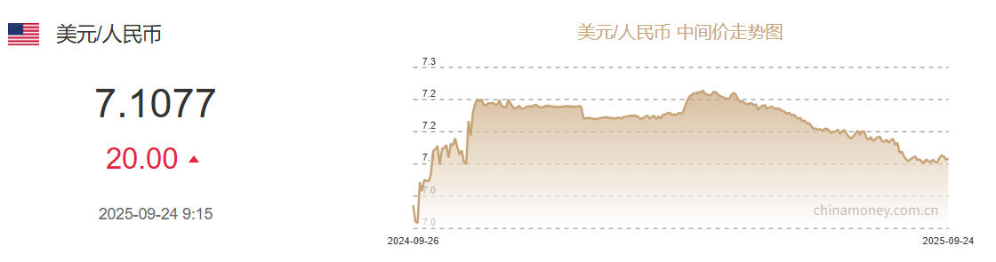 中新网9月24日电 据中国外汇交易中心网站消息,中国人民银行授权中国外汇交易中心公布,2025年9月24日银行间外汇市场人民币汇率中间价为:1美元对人民币7.1077元,下调20个基点。