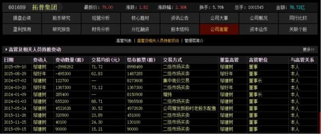 上周三晚间,拓普集团公告显示,邬建树、邬好年以及一致行动人宁波筑悦投资管理有限公司、宁波派舍置业有限公司于8月29日至9月10日期间通过集中竞价方式合计减持公司股份1343万股,占公司总股本的0.77%,套现约8.84亿元。