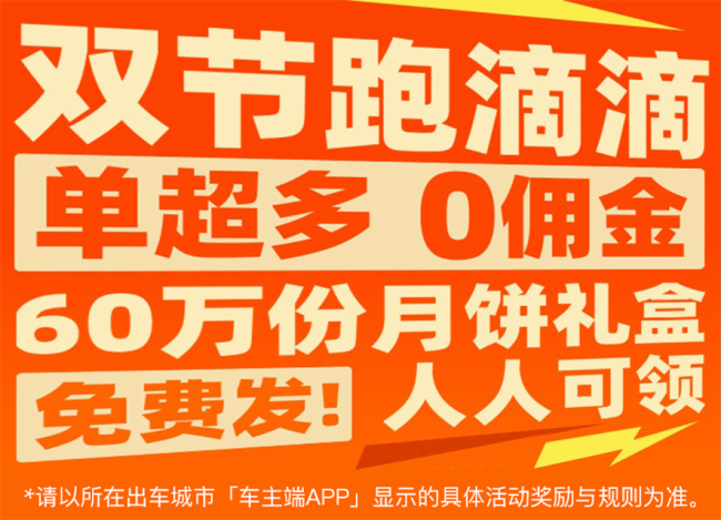 滴滴服务好司机,司机服务好乘客。双节假期出行需求高,为鼓励司机出车提供好服务,让师傅们优劳优得,共度佳节,滴滴将发放超4亿元司机补贴,推出“单超多,0佣金”奖励活动,为师傅们免费派发60万份月饼礼盒,送去节日温馨祝福。
