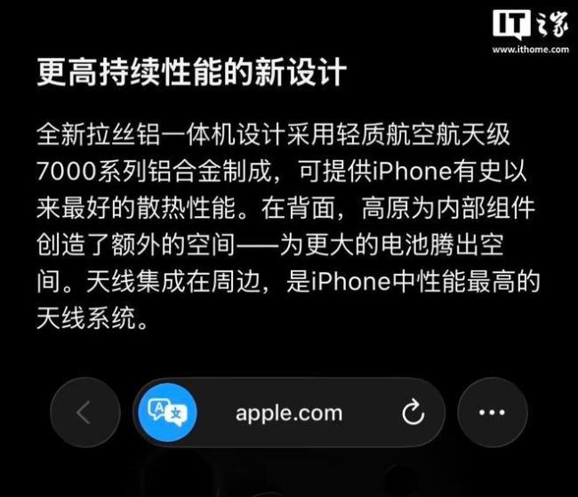 媒体指出,iPhone 17 Pro系列采用的是航空级7000系列铝合金,并配合超行业标准的阳极氧化硬化处理,整体耐用度值得肯定。与前代钛金属框架相比,新设计虽然在局部边缘存在权衡,但大幅提升了整机散热性能,带来更高的运行效率和更长的电池续航。此外,一体化铝机身提供了优异的手感。苹果回应iPhone17Pro划痕 展示机痕迹可清洁去除。