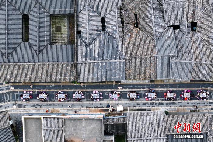 9月27日,四川省眉山市东坡区太和老镇,随着三声“开宴啰”响起,长街宴正式开席。现场50余张桌子座无虚席,凉拌鸡、东坡肘子、太和鲫鱼等经典菜肴依次上桌,吸引了400多名食客沉浸式体验这场充满烟火气的长街宴。图为航拍太和老镇长街宴和焕然一新的老房子。(无人机照片)中新社记者 刘忠俊 摄