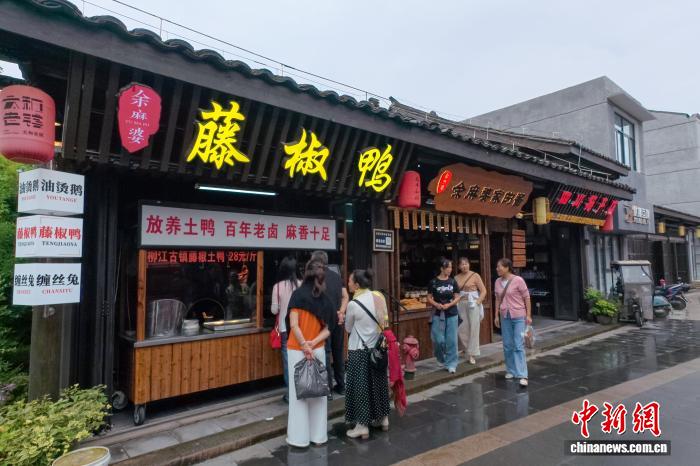 9月27日,四川省眉山市东坡区太和老镇,随着三声“开宴啰”响起,长街宴正式开席。现场50余张桌子座无虚席,凉拌鸡、东坡肘子、太和鲫鱼等经典菜肴依次上桌,吸引了400多名食客沉浸式体验这场充满烟火气的长街宴。图为太和老镇地方美食吸引游客们驻足。中新社记者 刘忠俊 摄