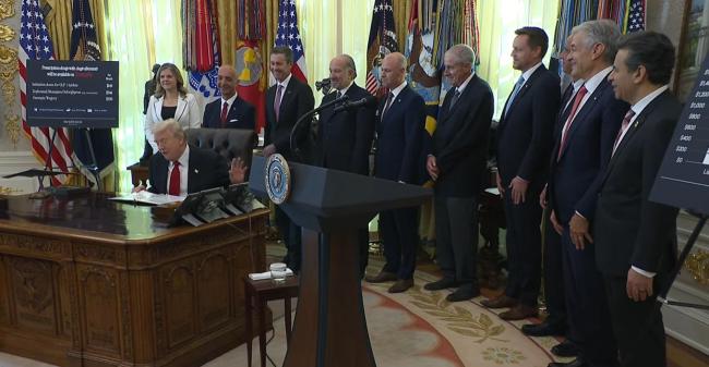 发布会重启后,特朗普表示这名公司高管当时有些头晕目眩,正在接受医生照护,目前状况良好。原定于当地时间上午11时举行的发布会延误到下午1点左右才开始。