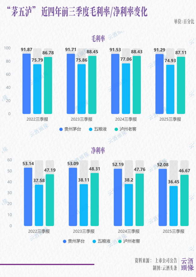 高位承压下的韧性考验根据财报数据,2025年前三季度,以“茅五泸”为代表的高端酒企毛利率与净利率虽普遍回落,但幅度较小,整体仍处于高位。贵州茅台继续展现出极强的盈利稳定性。2025年前三季度,公司毛利率达91.29%,较去年同期下降0.26个百分点,但仍牢牢维持在90%以上的高位区间;净利率为52.08%,同比微降0.21个百分点。在行业整体承压背景下,茅台实现营收1284.54亿元、净利润646.27亿元,双双保持正增长。这一表现凸显出其在调整期中强大的定价权与品牌溢价能力。五粮液的利润指标波动相对更明显。前三季度毛利率为74.93%,同比下降2.77个百分点;净利率36.45%,较去年同期下降4.58个百分点,为近三年来首次负增长。调整期内,头部企业在渠道管理与价格体系维护上均面临压力。不过,从绝对水平看,五粮液依然维持近75%的毛利率,仍属行业高位。泸州老窖表现相对稳健。前三季度毛利率87.11%,净利率46.67%,同比分别下降1.49和2.27个百分点。尽管增速放缓,但其毛利率继续稳居行业第二,产品结构优化与成本控制的成效正在持续释放价值。整体来看,“茅五泸”近两年虽出现毛利率与净利率小幅波动,但核心业务底盘稳固,其80%以上的盈利水平在消费品乃至全行业中均属罕见。这种“高基数上的稳态”,恰恰印证了头部白酒企业穿越周期的韧性。