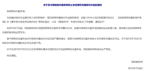 这种长期无序的状态不仅阻碍了行业的健康发展,也最终引来监管的强力介入。国家版权局于2015年7月发布《关于责令网络音乐服务商停止未经授权传播音乐作品的通知》,要求所有平台在规定期限内下架未经授权内容,并提交整改报告。