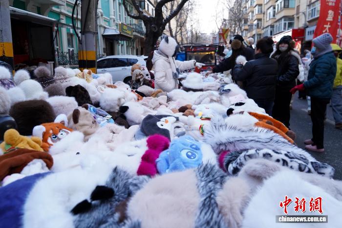 12月2日,黑龙江哈尔滨,游人选购保暖物品。当日,黑龙江哈尔滨最高气温今冬首次降到-10℃以下 ,在哈尔滨红专街早市,棉帽子、大花袄等保暖物品摆上街头,游人纷纷选购。中新社记者 赵宇航 摄