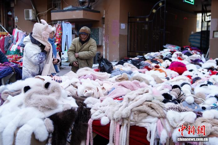 12月2日,黑龙江哈尔滨,游人选购棉帽子。当日,黑龙江哈尔滨最高气温今冬首次降到-10℃以下 ,在哈尔滨红专街早市,棉帽子、大花袄等保暖物品摆上街头,游人纷纷选购。中新社记者 赵宇航 摄