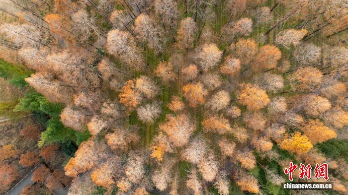 12月1日,位于河南郑州黄河迎宾馆的水杉林一片绯红,层林尽染,成为冬日里“美拉德”色系的别致风景。图为多彩斑斓的初冬树林。(无人机照片)赵梦阳 摄