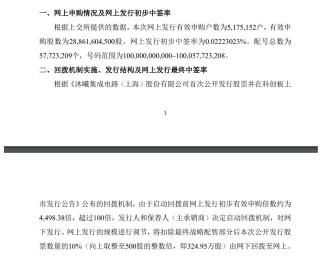 12月7日,沐曦股份发布公告称,回拨机制启动后,网下最终发行数量为2282.9081万股,占扣除最终战略配售部分后本次发行数量的70.26%,网上最终发行数量为966.55万股,占扣除最终战略配售部分后本次发行数量的29.74%。网上发行初步中签率为0.02223023%,回拨机制启动后,网上发行最终中签率为0.03348913%。