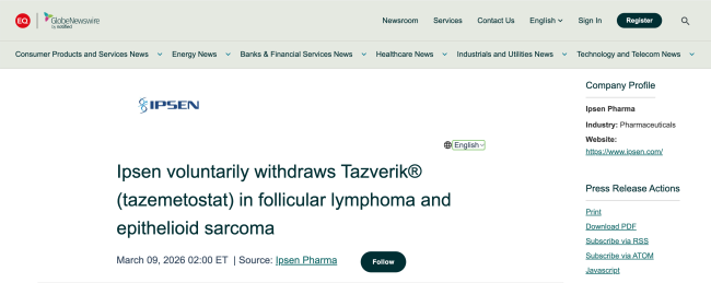 根据益普生的通报,该研究的独立数据监察委员会(IDMC)在审查了SYMPHONY-1研究的最新数据后建议,基于继发性血液系统恶性肿瘤的不良事件,该治疗方案的潜在风险可能已超过患者的潜在获益。基于这些数据,益普生已决定即时将达唯珂®撤市,包括滤泡性淋巴瘤(FL)和上皮样肉瘤(ES)两项适应症。