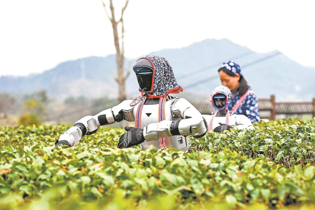 同一天,在湖北省黄冈市英山县乌云山村茶园,智能机器人与茶农一同采摘春茶,利用科技手段助力春耕生产。