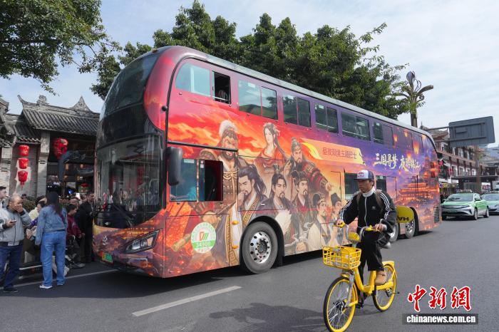 4月1日,四川成都,“三国寻梦线”双层主题巴士抵达武侯祠博物馆。中新社记者 安源 摄