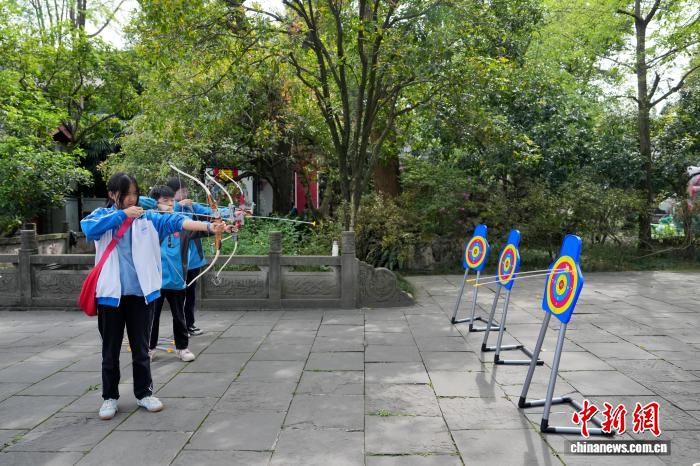 4月1日,四川成都,小学生在玩射箭游戏。中新社记者 安源 摄