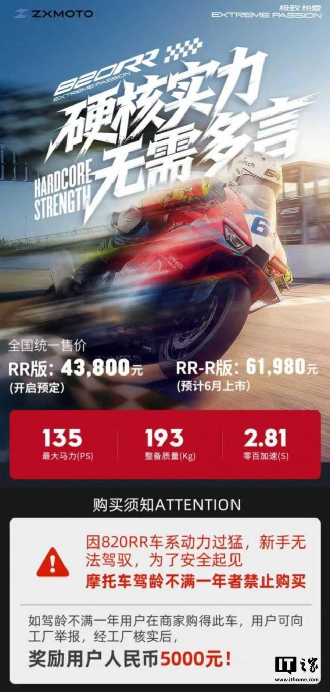 3月21日,张雪机车的新产品ZX 820RR和ZX 500RR在微信小程序上独家发售。为了确保用户安全并防止盲目追新,张雪机车在小程序上设置了“限售”措施。下单时,小程序会弹出提示,要求用户必须满足驾龄一年以上才能购买。官方订购页面还特别说明,因820RR车系动力过猛,新手无法驾驭,驾龄不满一年者禁止购买。如果驾龄不满一年的用户通过其他渠道购得此车,可以向工厂举报,经核实后,用户将获得5000元人民币的奖励。