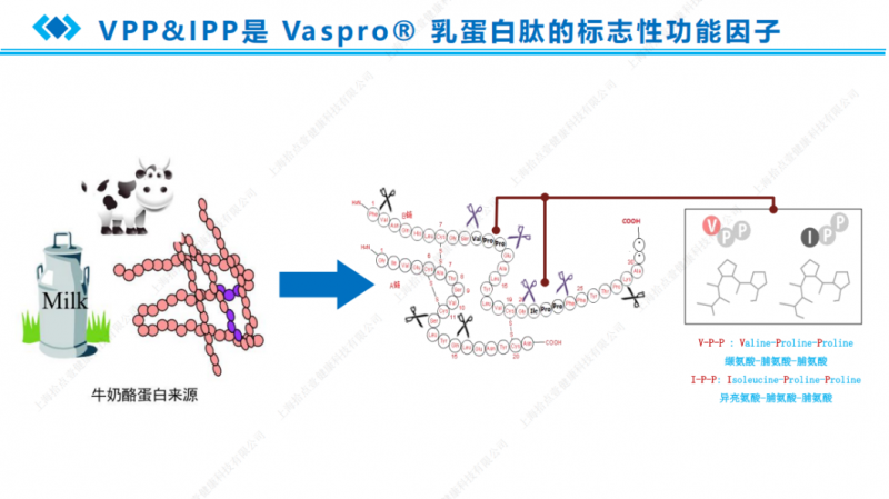 Vaspro®乳蛋白肽的诞生,始于对天然食材的智慧传承与科学探索。其原料精选自纯净的牛奶酪蛋白,通过生物酶解工艺,将大分子蛋白质分解为易被吸收的小分子肽。其中核心功能性成分缬氨酸-脯氨酸-脯氨酸(VPP)与异亮氨酸-脯氨酸-脯氨酸(IPP)两种三肽,被科学界称为“乳三肽”,在产品中的含量稳定高于5%,奠定了其发挥健康效用的科学基础。