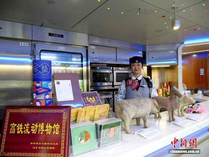 车厢内,印着汉景帝阳陵博物院馆藏文物塑衣式彩绘拱手跽坐女俑“姗姗”卡通形象的风筝悬于车顶,汉乐府竹简书张贴在板壁间,餐车角落,象征“六畜兴旺”的汉代陶猪、陶羊等文物复制品静默摆放,列车车厢被装点成一座充满古韵的微型文化驿站。