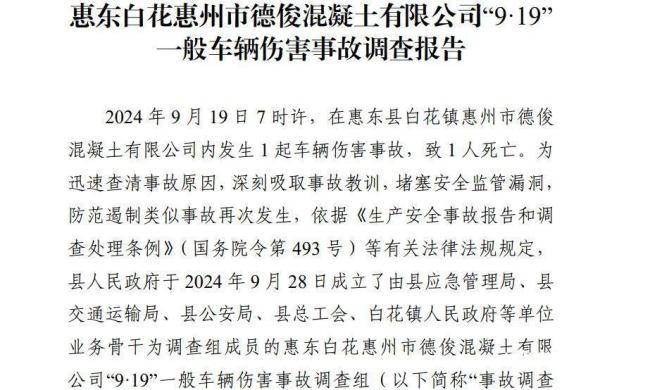 当地通报洒水车溜坡碾压司机致死 违规操作酿悲剧。近日,惠州市惠东县应急管理局发布了《惠东白花惠州市德俊混凝土有限公司“9·19”一般车辆伤害事故调查报告》,详细说明了这起场内洒水车溜坡致人死亡的事件。报告指出,这是一起因驾驶员违规操作和企业安全生产主体责任落实不到位引发的一般生产安全责任事故,涉事作业车辆经查实为套牌车。