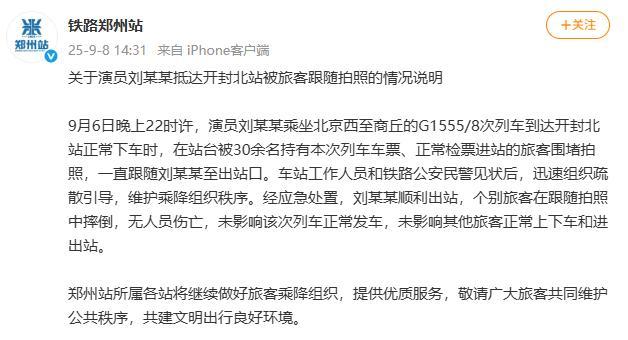 9月8日,铁路郑州站官方微博发布了一则关于演员刘某某抵达开封北站被旅客跟随拍照的情况说明
