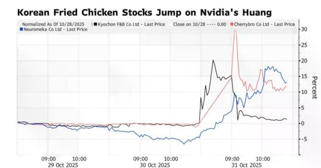 北京时间10月31日,英伟达CEO黄仁勋与三星电子会长李在镕、现代汽车执行会长郑义宣在韩国一家名为Kkanbu Chicken的炸鸡连锁店共饮啤酒