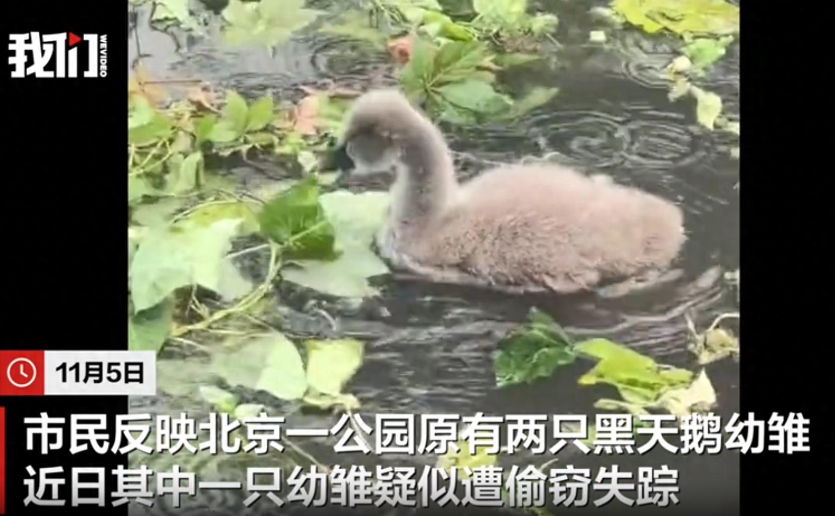 11月5日,有市民反映北京一公园内原本有两只黑天鹅幼雏,但最近其中一只幼雏疑似被盗失踪。公园管理处工作人员称,园内原来有一对成年黑天鹅和两只幼雏,发现幼雏失踪后已报警,并正在加装监控设备以预防类似事件再次发生