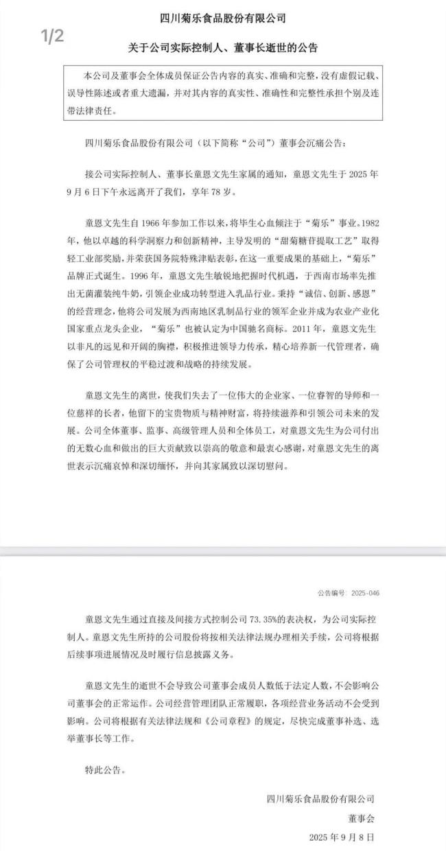 9月8日晚间,菊乐股份发布公告称,接到董事长童恩文家属通知,公司董事长童恩文于9月6日下午逝世,享年78岁。