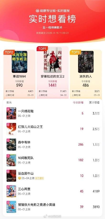 2026年五一档期,已有18部影片定档。《穿普拉达的女王2》在猫眼想看榜上表现突出,累计想看人数超过11.4万,位居榜首。紧随其后的是《寒战1994》和《消失的人》。这些电影中,你最期待哪一部?可以在评论区分享你的看法