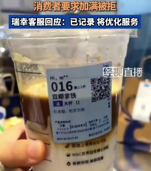 近日,北京一位网友反映,她在瑞幸咖啡王府井奥莱town up店购买的去冰双椰拿铁,到手饮品仅有半杯。提出加满椰子水后被店员拒绝,对方称“店里规定不加冰就是半杯”。对此,瑞幸客服表示,将优化门店服务质量,力争为消费者提供更好的体验。该网友表示...