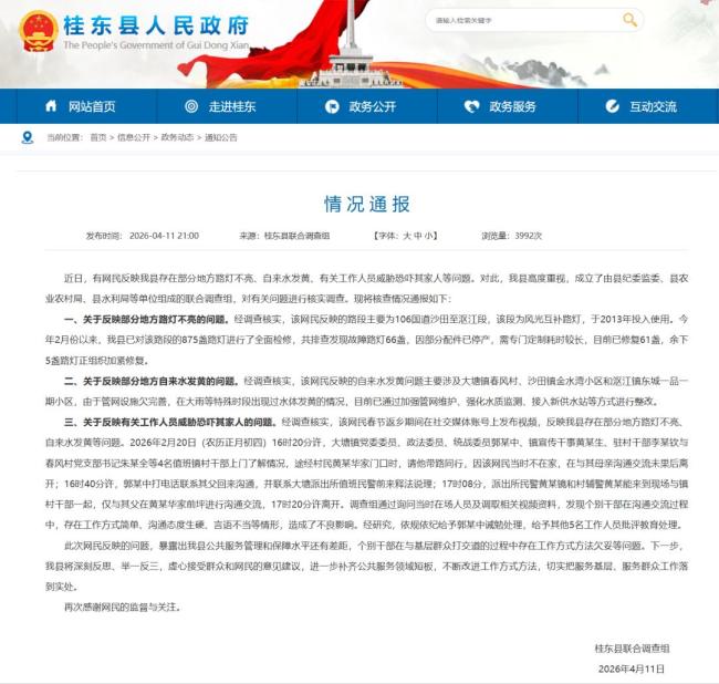 近日,湖南省郴州市桂东县大塘镇村民黄先生发布视频称,自己因反映国道、隧道路灯大面积损坏不亮,遭到镇干部上门威胁。4月11日晚,桂东县联合调查组发布了情况通报