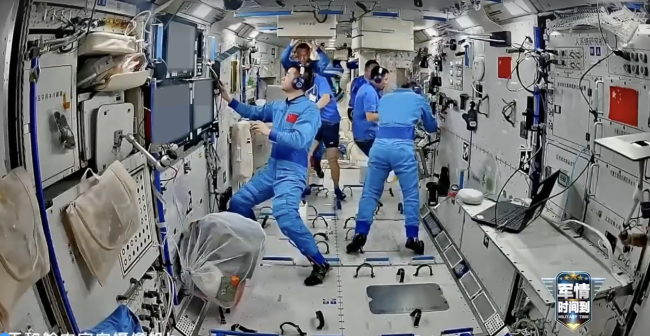 转自:中国反邪教#中国空间站6人最新画面#【#神20神21乘组同框画面#】目前,神舟二十号航天员乘组工作生活正常