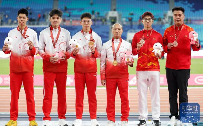 11月19日,第十五届全国运动会田径项目男子200米决赛在广州举行。广东队选手施君豪获得冠军,他的队友林健豪获得亚军,重庆队选手官鑫获得季军。颁奖仪式上,施君豪、林健豪和官鑫与教练合影留念