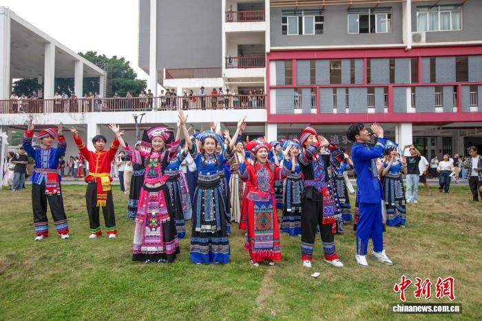 图为南宁职业技术大学学生在对唱山歌。南宁职业技术大学 供图 图为南宁职业技术大学学生在表演民族服装秀。南宁职业技术大学 供图