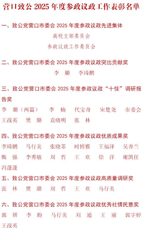近日,致公党营口市委会召开了2025年度参政议政工作总结会议暨2026年度参政议政立题会议。市委会领导班子、市委委员、各支部、各专委会代表,参政议政专委会骨干党员参会,会议由市委会副主委王战英主持。